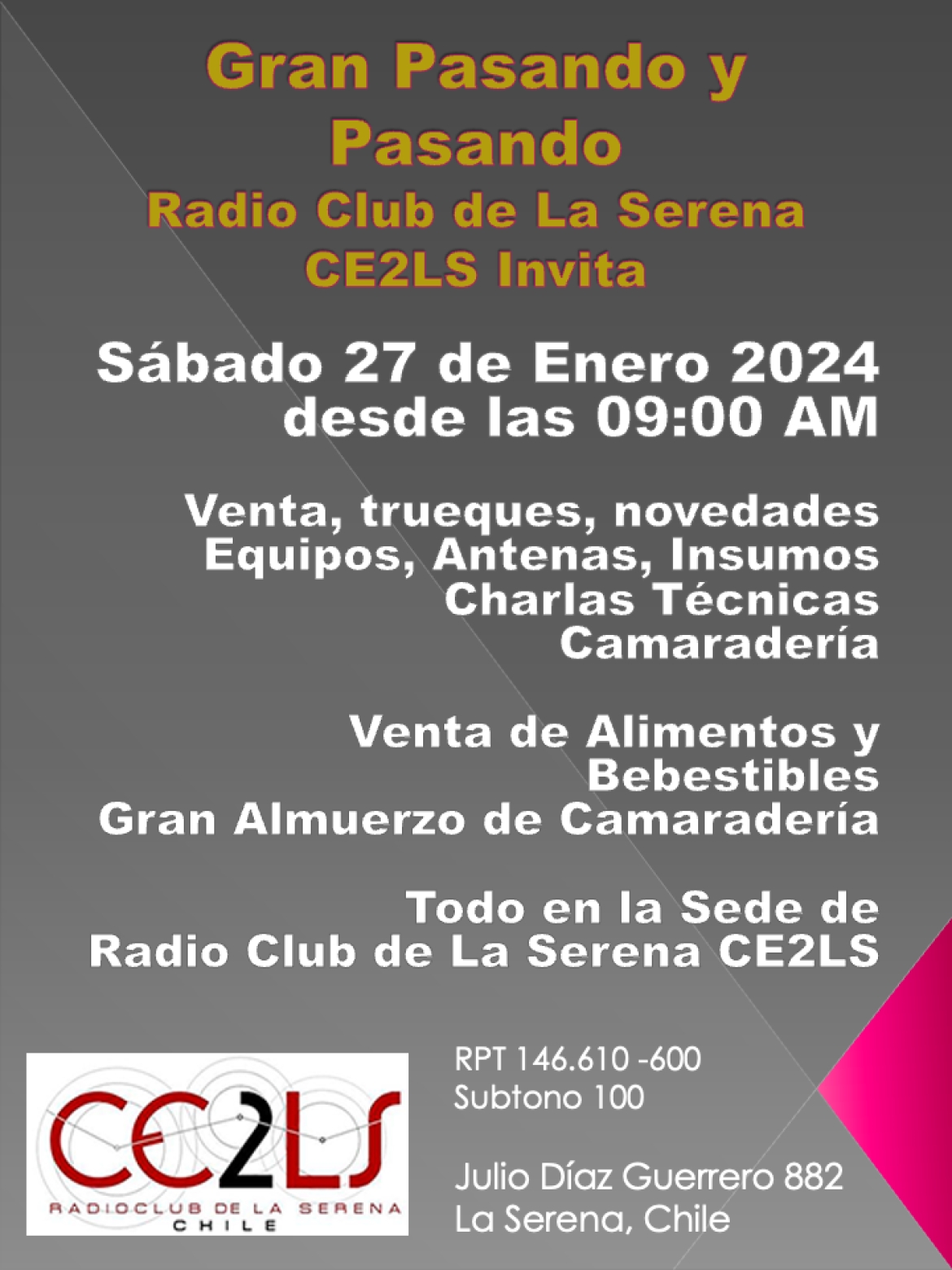 Radio Club de La Serena tiene el agrado de invitar a este maravilloso evento donde podrás compartir con otros radioaficionados, comprar o vender accesorios e incluso tendremos comida.